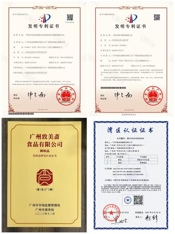 近年来,致美斋聚焦市场需求变化趋势,坚持健康化与功能化导向,2025年创新研发22个产品,同步完成9个产品优化并在阳西基地投产。8款产品14个规格获得首批“食在广州”品牌产品认证,零添加天顶生抽、喜粤酱油2款产品4个规格获得广东粤港澳大湾区认证促进中心颁发的湾区认证证书,获评儿童番茄沙司质量规范团体标准起草单位。新品陈皮酱油的上市开拓了致美斋健康酱油领域赛道,上新甄选海鲜酱、味鲜酱、好味酱和鲜咸调味汁等适配餐饮客户定制化需求产品,在餐调定制领域取得良好开局。截至目前,致美斋拥有38项专利授权,其中发明专利6项,覆盖酱油、食醋、南腐乳、复合调味料等品类。研发课题获2024年第二届广州国资创新大赛优秀奖,“古法酿造加现代智造:416年老字号致美斋食醋工艺再升级”入选《国企管理》论文集参编名录;相关研发项目获百万级政策资金支持,微生物快检技术研究项目获批阳江市2024年省科技支撑“百千万工程”项目补助经费。